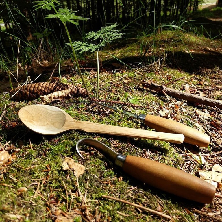 Alle notwendigen Materialien und Werkzeuge (Löffelholz, Hackstöcke, Beile, Rundmesser, Schnitzmesser) werden gestellt.